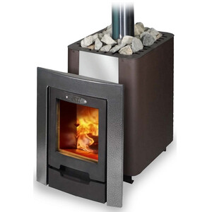 Банная печь оснащена стальной дверкой со стеклом, немецкого производства Schott Robax, благодаря которому можно наслаждаться горением дров из комнаты отдыха.